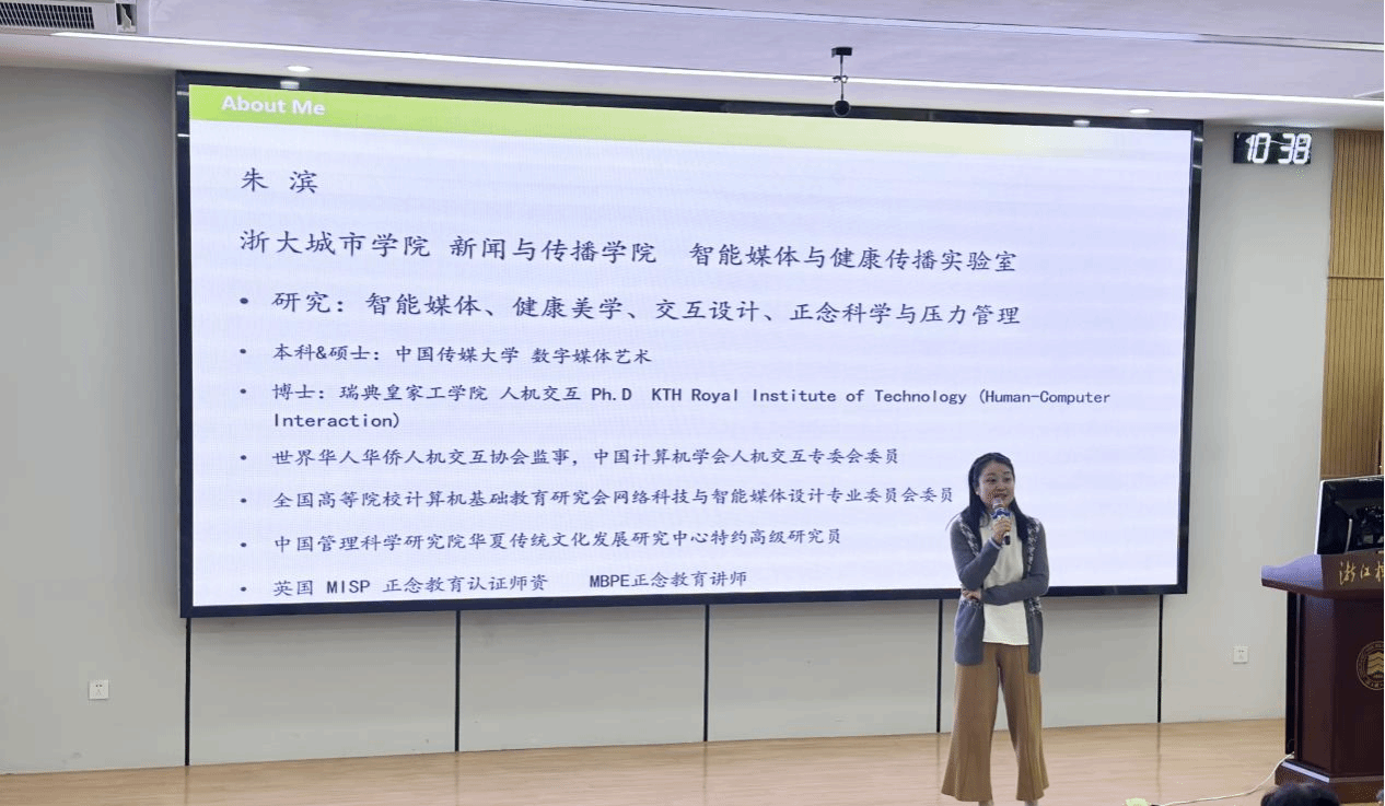 会上,张元亭教授以“⼼脑⾎管健康⼯程:从智能可穿戴技术到健康使命”为题,概述了健康工程的基本概念与社会需求,介绍如何整合从分子、细胞、器官到系统的生物层次中多个尺度的技术而实现融合健康之概念。以血压图(Tonoarteriography),⼀种可穿戴, 无扰式(unobtrusive), 连续血压测量的“MINDS”技术为重点,结合纳米生物标志物检测、医学成像和机器学习,讨论预测急性心血脑血管疾病的新进展。说明如何融合可穿戴传感技术和个性化智能医生系统来实施具有预测性、预防性、精确性、普遍性、个体性、参与性、先法性和以患者为中心的 8-P 健康范式。随后,浙大城市学院新闻与传播学院朱滨博士分享了中国美学启示下的健康信息交互设计的主题报告。通过介绍东方文化与数智科技相融合,探讨多感官体验的沉浸式身心健康美学与信息交互设计,探索信息科技在中国语境下的发展方向。历时2个多小时的主题报告后,学院教师和研究生们提问互动,专家一一答复,意犹未尽……