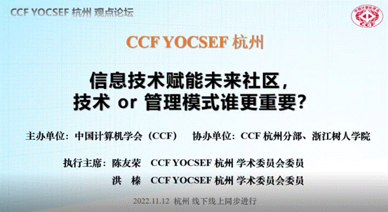 11月12日,“中国计算机学会青年科技论坛(CCF Young Computer Scientists & Engineers Forum,CCF YOCSEF)杭州”与公海gh555000aa线路检测联合举办“信息技术赋能未来社区,技术or管理模式谁更重要?”观点论坛,就“信息技术赋能未来社区,技术or管理模式谁更重要”话题展开讨论和思辨。一百余名高校和企业的专家、学者以线上或线下方式参加了本次论坛,公海gh555000aa线路检测副董事长叶时平作为引导嘉宾进行引导发言,公司党委书记兼常务副经理王章权、副经理张登辉全程参加本次活动,CCF YOCSEF杭州分论坛AC委员陈友荣教授与浙江工业大学洪榛教授作为执行主席联合主持本次论坛。
