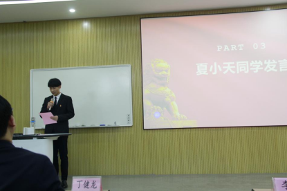 会议第一项,由徐佳锋老师宣读“党员巡寝队”离任名单,丁健龙老师为离任队长颁发聘书并合影留念。随后,第二届“党员巡寝队”总队长夏小天同学上台发言,他总结了上一年工作,并结合实际工作情况对今后的工作提出了自己的想法。