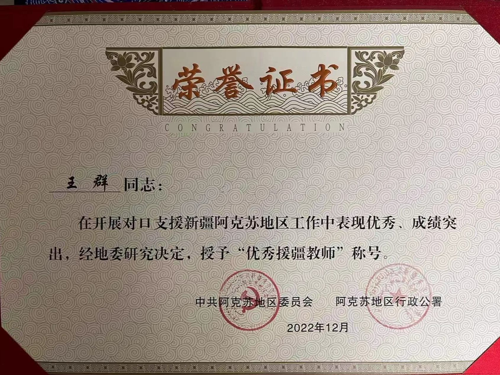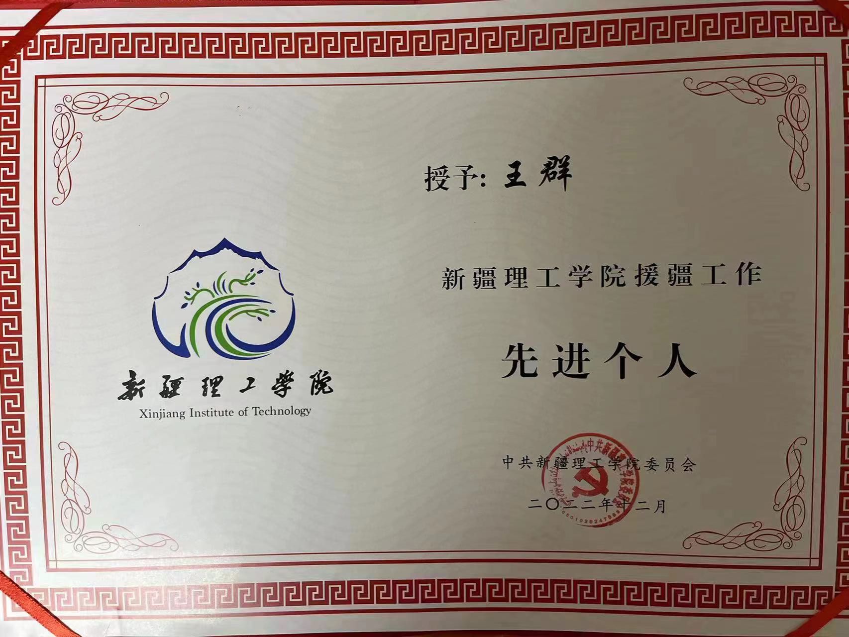 绩:援疆期间,王群在新疆理工学院学年考核优秀;获新疆理工学院援疆工作“先进个人”;获中共阿克苏地区委员会颁发的“优秀援疆教师”称号。