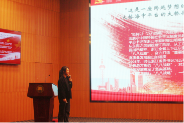 生环学院杨光珍讲述了习近平总书记推荐的著作《老人与海》,使同学们重新在这本经典名著中得到了新的意义:在困难前一次又一次坚定不移,永远满怀希望的奔向未来。段丹丹通过习近平总书记在浙江的故事—杭州湾跨海大桥的建造,代表了浙江精神,也展现了浙江人民的务实肯干、勇于创新。