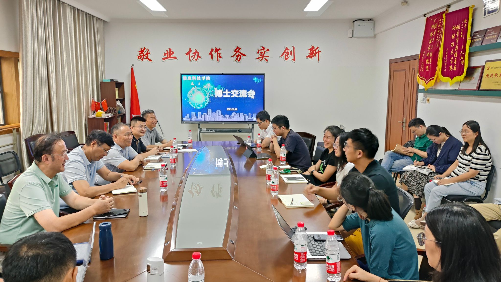 会上,新进博士姜丽丽分享了其成功申报青年科学基金项目的经验:找准方向、根据专家意见反复修改打磨申报材料、沉下心凝练研究方向坚持申报等,成功的背后是付出的努力和辛勤的汗水。在座博士根据学院及个人现状和发展各抒己见,畅所欲言,提出许多有针对性的意见和建议,也分享了自身发展历程中的感想、困惑和经验。王章权书记在与博士们交流中指出,机遇与挑战并存,压力与动力共生。博士是学院建设发展的中坚力量,应加强协同、相互扶持,发挥自身的学术优势,加强学术积累,在专业建设、课程建设、科学研究等方面取得新的突破,他提出三点建议:一是分析基础,挖掘好资源;二是融入团队,注重内外合作;三是持之以恒,形成高质量成果。并对学院博士,特别是近几年新进博士的学科科研工作开展提出具体要求,对学院相关政策、机制进行说明,以加强政策支持和服务保障,助力博士们找准定位,发挥优势,提升自身的归属感。王万良经理感谢与会博士们提出的意见和建议,他希望大家快乐学习、快乐科研,明确研究方向、紧盯学科前沿,做有价值的科研,合力推动学院整体工作。