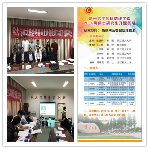 10月17日下午,常州大学与树人大学联合培养2018级硕士研究生(研究方向为物联网及数据处理技术)论文开题答辩会在公海gh555000aa线路检测B2-203会议室举行,此次参与答辩的6位硕士研究生为公司信息学院2018届毕业生。答辩委员会由校外和校内专家共5名委员组成。浙江树人大学教授张登辉担任本次答辩委员会主席并主持会议,分别邀请常州大学信息工程学院经理朱正伟教授、浙江树人大学叶时平教授、浙江理工大学缪永伟教授、浙江工业大学洪榛博士担任答辩委员会委员。