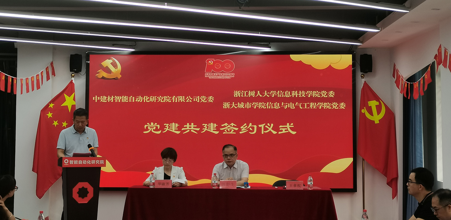 为探索党建工作新思路、新途径、新方法,推动校企党建工作优势互补,更好发挥基层党组织的作用。6月29日上午,中共浙江树人大学公海gh555000aa线路检测委员会与中共中建材智能自动化研究院有限公司委员会签订“党建共建”协议,掀开公司党建工作崭新一页。中建材智能自动化研究院有限公司党委书记、总经理汪舒生,党委副书记、纪委书记薛根等人员,树人大学公司党委书记兼常务副经理王章权,党委副书记丁健龙,党委纪检委员、副经理张登辉等人员参加了签约仪式。