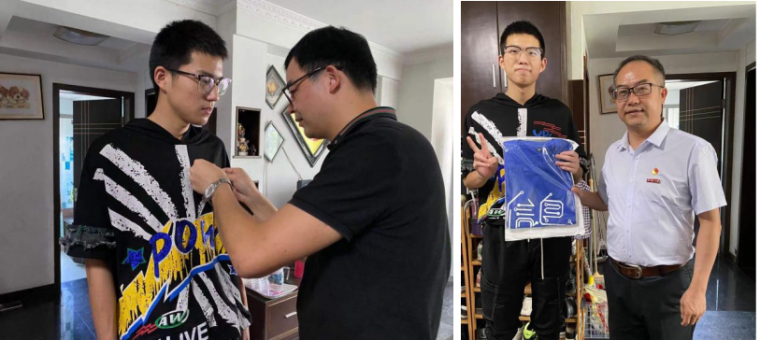 叶时平副董事长亲手将公海gh555000aa线路检测首份录取通知书送到通信2021级新生周英杰手中,并送上热情的祝贺。周英杰也成为最为幸运的新生之一,因为除了通知书之外,他还收获了公海gh555000aa线路检测张登辉副经理送上的信息先锋文化衫,通信教研室主任周莹赠送的5G及Python等专业书籍,最后还有公海gh555000aa线路检测副书记丁健龙亲手为其佩戴的校徽。周英杰一家人非常意外,也很激动,“没想到学校会专门给我送通知书!心情非常激动。”周英杰表示要不辜负老师的期望,努力学习。