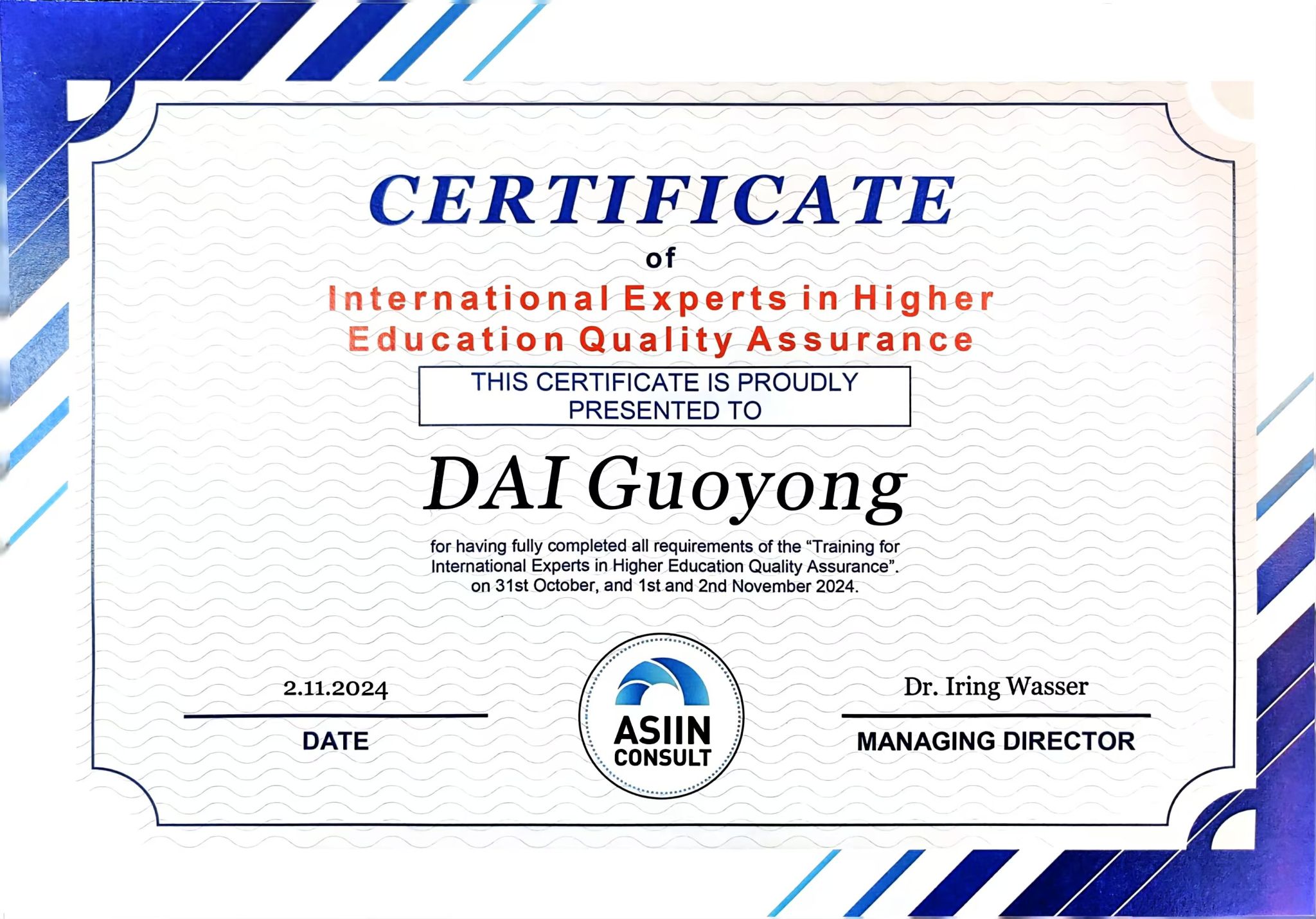 2024年10月31日至11月3日,戴国勇老师参加了在上海举办的ASIIN国际认证专家培训和研讨会。本次活动由上海工程技术大学和中德产学研用创新联合体秘书处联合主办,ASIIN认证协会与慕尼黑应用科技大学协办。来自国内外多所高校和教育机构的专家学者齐聚一堂,共同探讨高等教育质量保障与认证的前沿议题。在为期四天的培训中,戴老师深入学习了ASIIN认证的标准、程序和要求,参与了模拟评审、案例分析等实践环节,并与国际同行进行了广泛的交流与合作。通过系统的学习和实践,戴老师不仅加深了对高等教育认证体系的理解,还提升了自身的评审技能和国际化视野。
