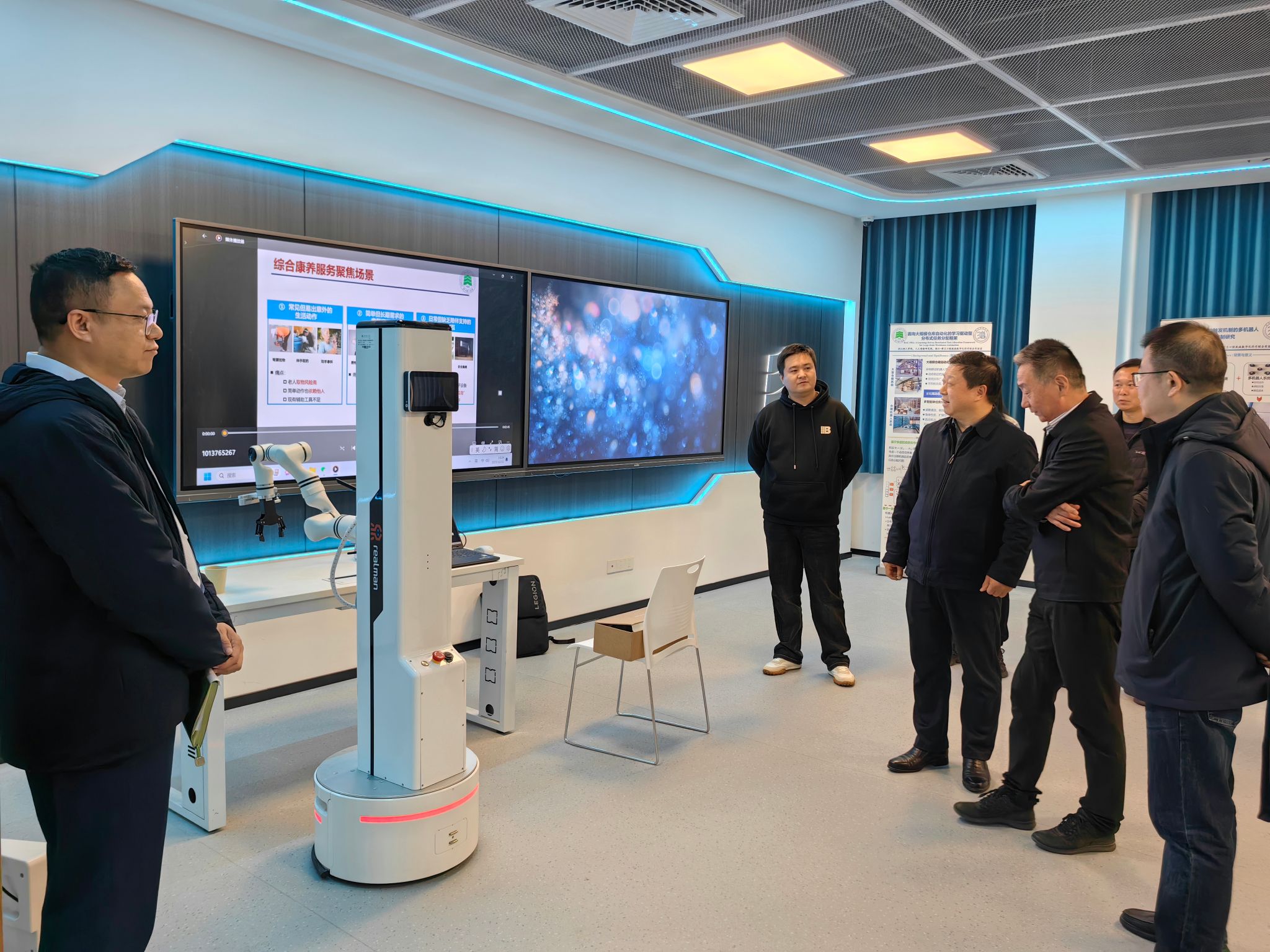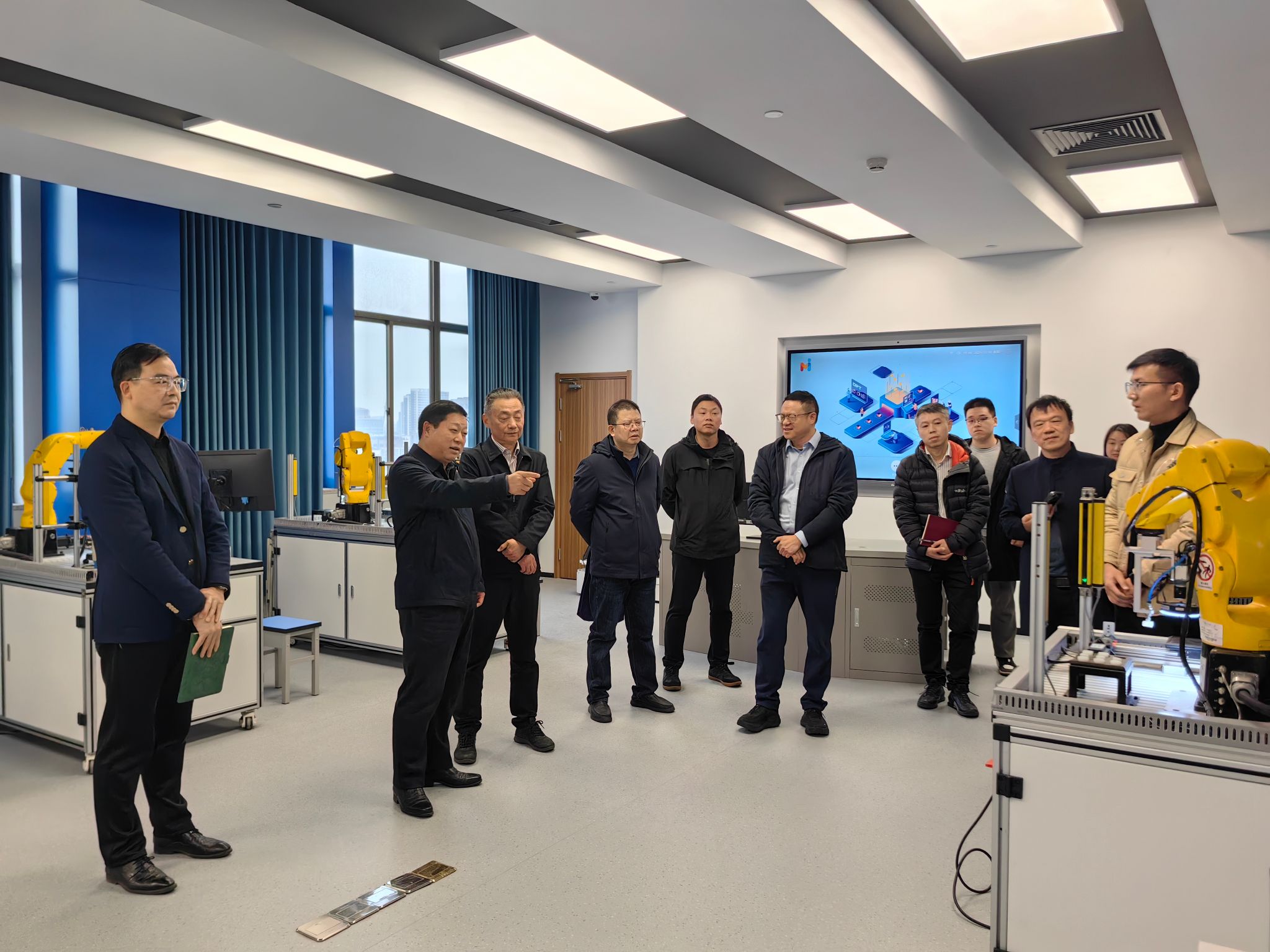随后,调研组前往公海gh555000aa线路检测人工智能研究院,先后走访了多个特色实验室和数据中心。在实验室中,学院骨干教师详细介绍了虚实结合的机器人实训平台、智能影像计算、服务机器人等前沿研究方向,展示了学院在人工智能领域的科研成果。调研组成员饶有兴致了体验了机器人取物等应用场景,并与科研团队就技术研发瓶颈、成果转化路径等问题展开深入交流。