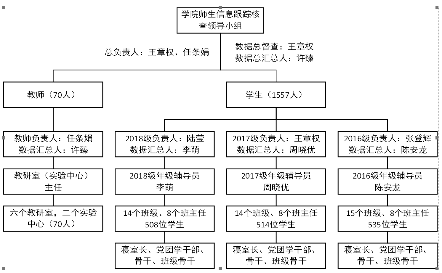 成员:许臻、李萌、陈安龙、周晓优,教研室(实验中心)主任、班主任(详见附件:学院班主任名单)。