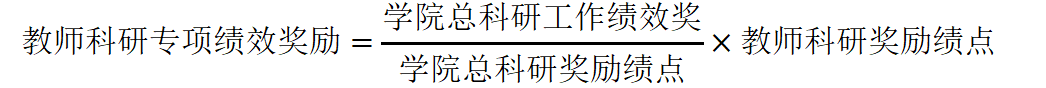 根据学校下拨总奖励经费及学院《年度考评与绩效分配方案(试行)》(浙树大公海gh555000aa线路检测[2022]02号)文件,科研工作绩效奖共可发放经费41万元,发放对象为全校为学院两级考核科研工作专项作出贡献的教师,其绩效奖励根据每位教师科研绩点乘以权重系数得到的科研奖励绩点按以下公式计算: