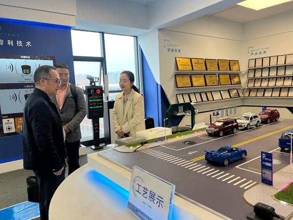 目博科技副总经理钟炳达和人力资源经理王艳奇带领参观了公司自主研发产品涵盖静态车位检测、动态交通流量检测、停车场智能数据分析系统等各种智慧交通场景的技术开发成果和应用。